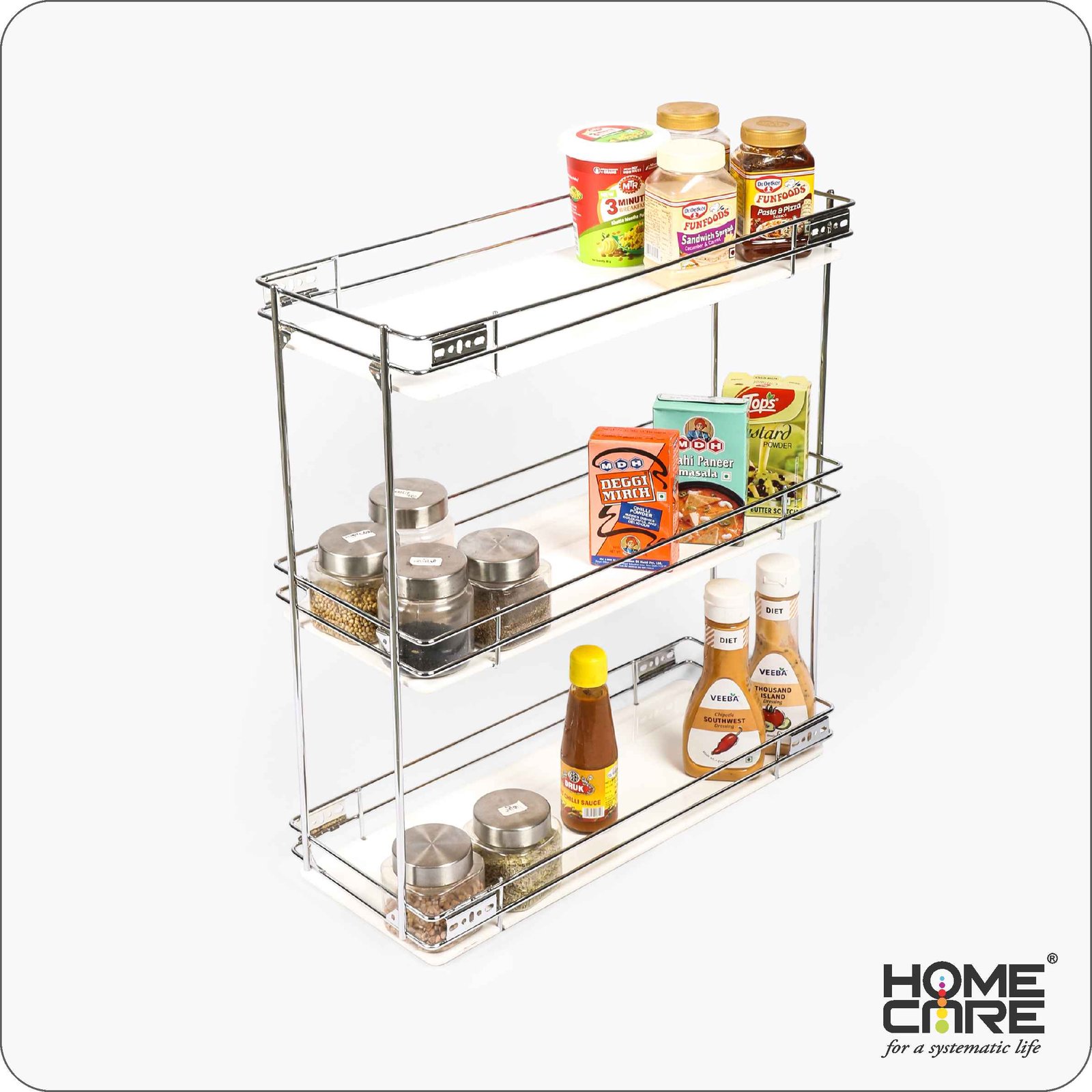 How to use each inch of your kitchen space and yet look smart. This Bottle Pullout is a clear example. A very useful innovation, it can be fitted wherever there is an under shelf space. What is more, it can be taken out and moved easily. This is perfect for keeping Bottles & Cans and many other things.