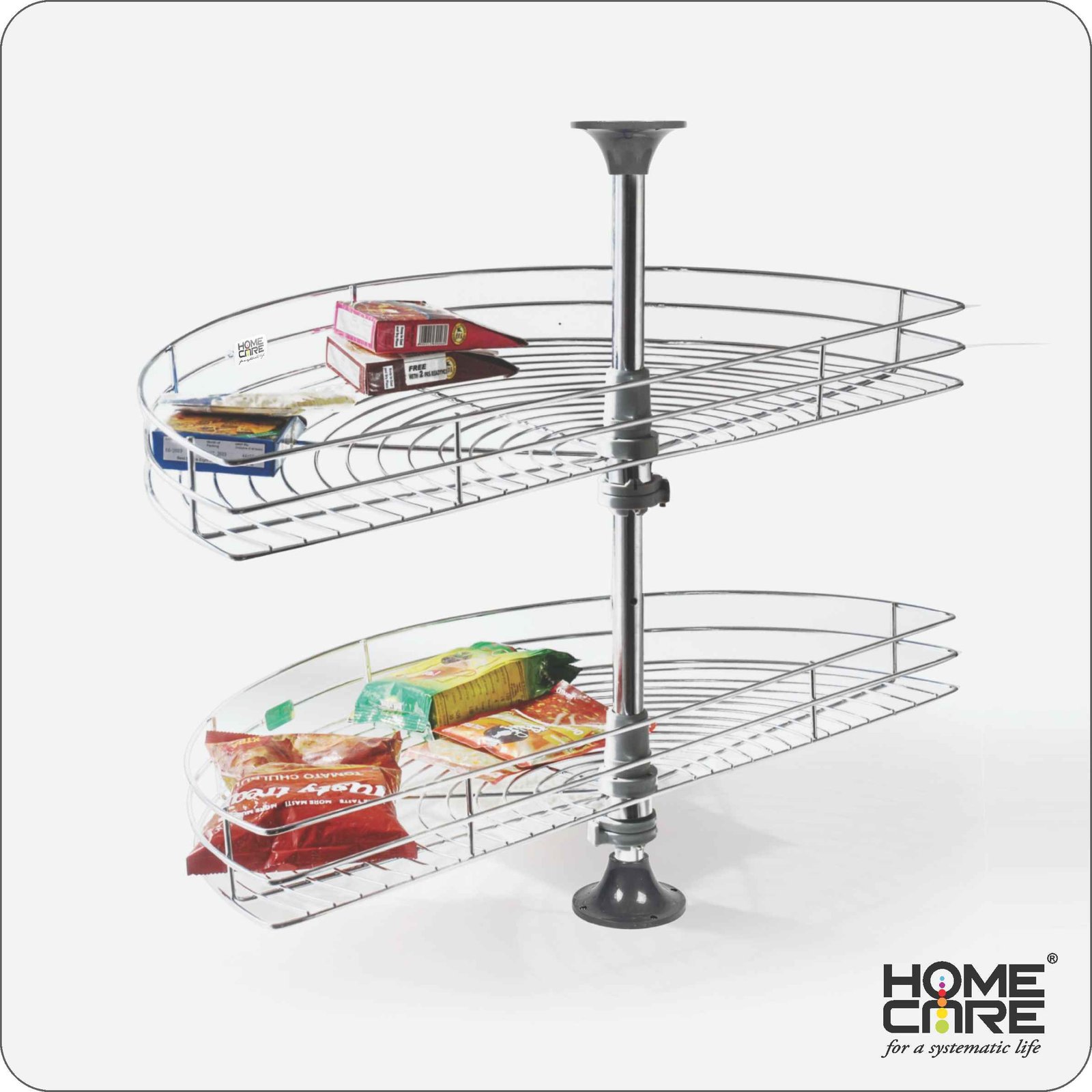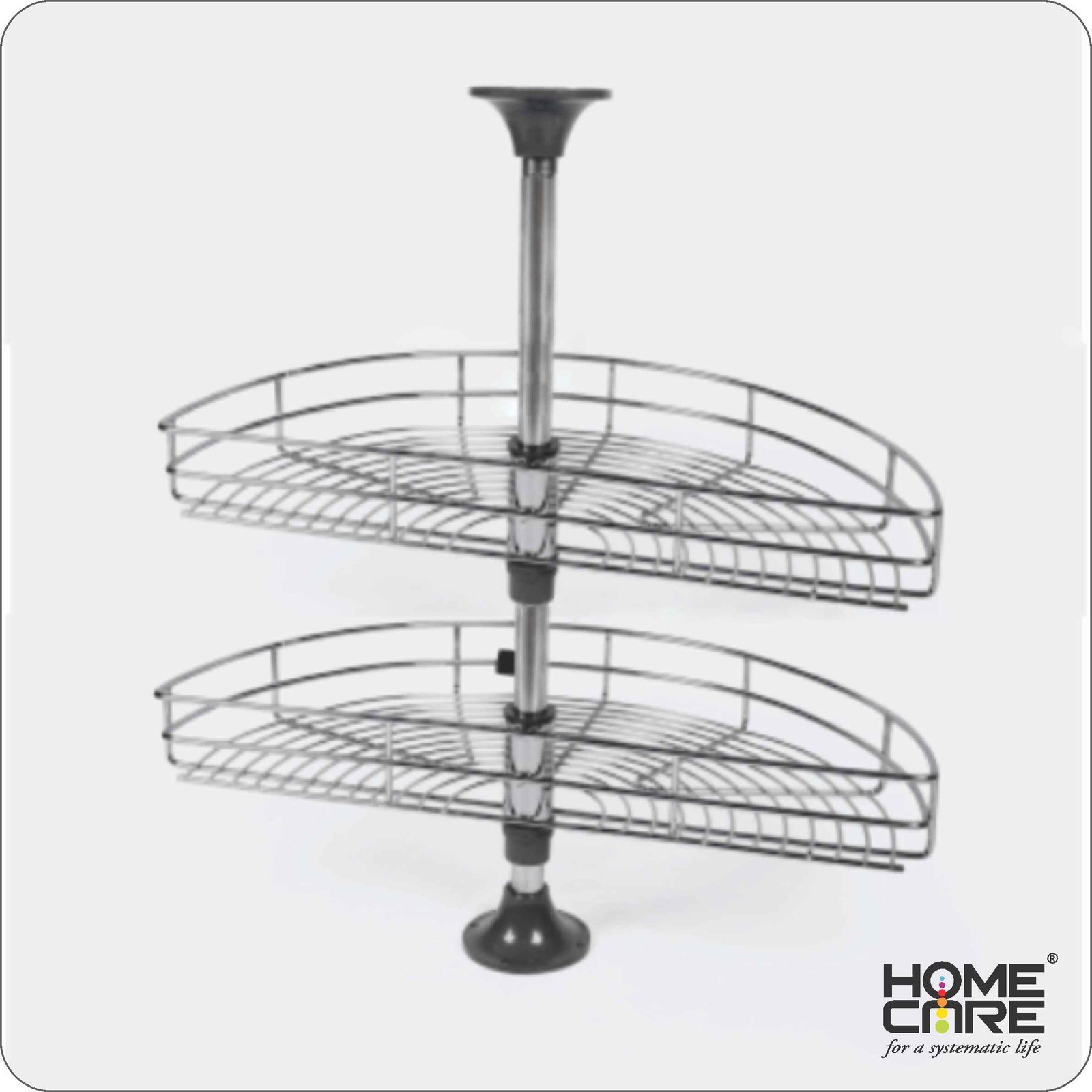 Two semi-circular SS wireframe baskets are attached to a single SS pole through quickfitt adjustable holders. Height can be adjusted for each tray. Easily swivels when in position. Holds all odds and ends securely.