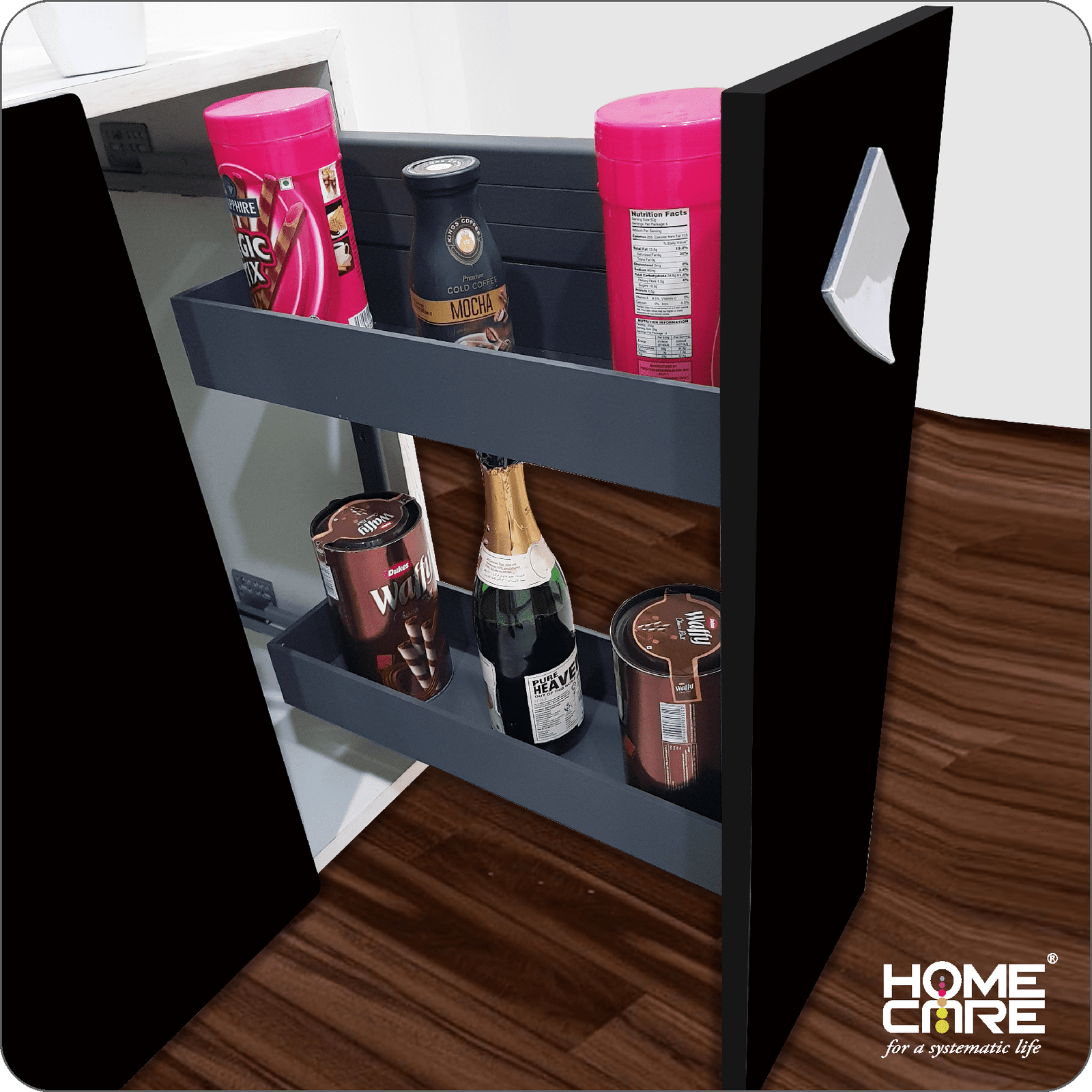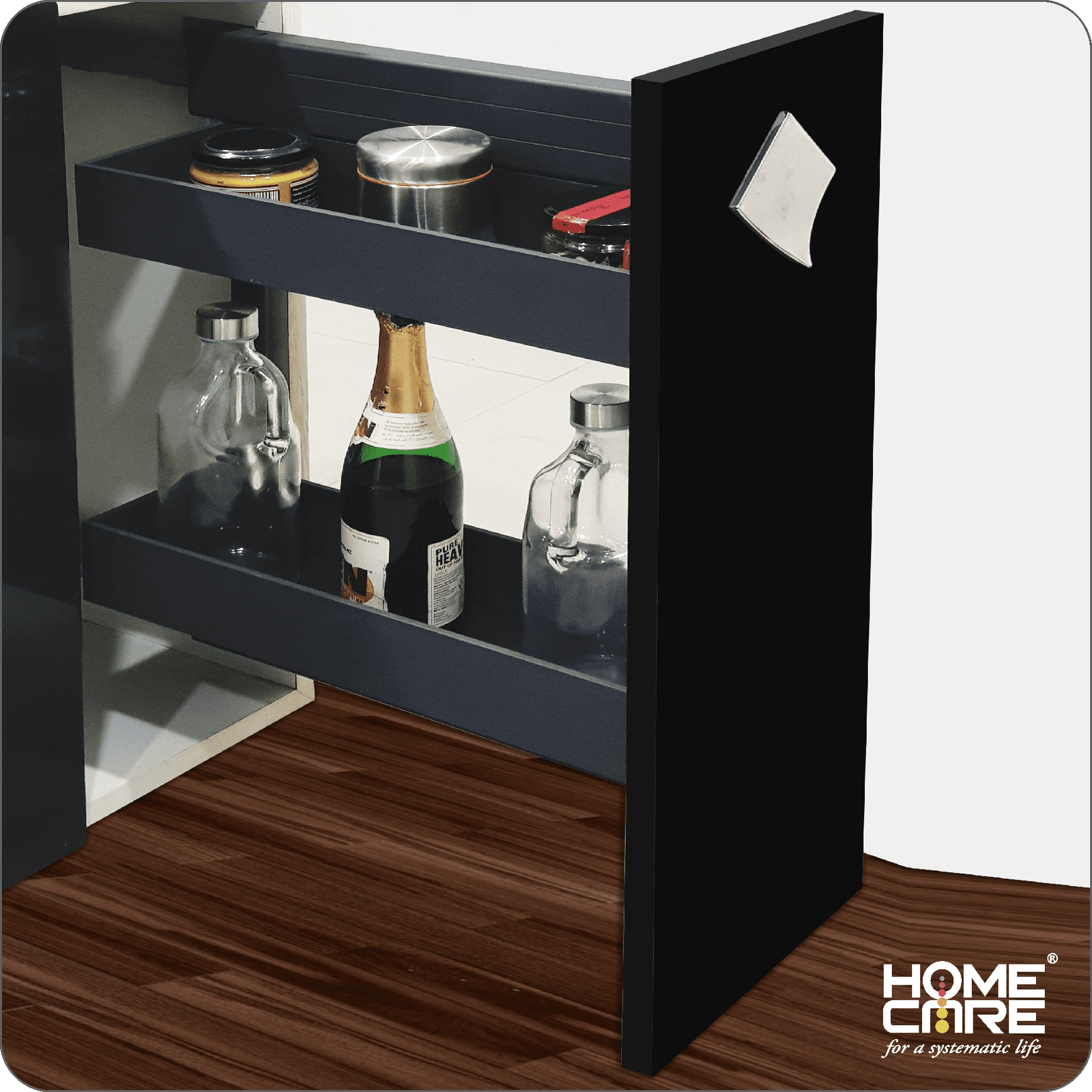 2. Side Mounting pullout can be conveniently used for storage of bottles, Cans or Souce or many Spices Bottle on the bottom shelf & Upper Shelf.